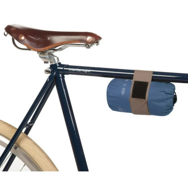 - Rangement en pochette pour un encombrement minimal, avec système d’accrochage au vélo/sac à dos