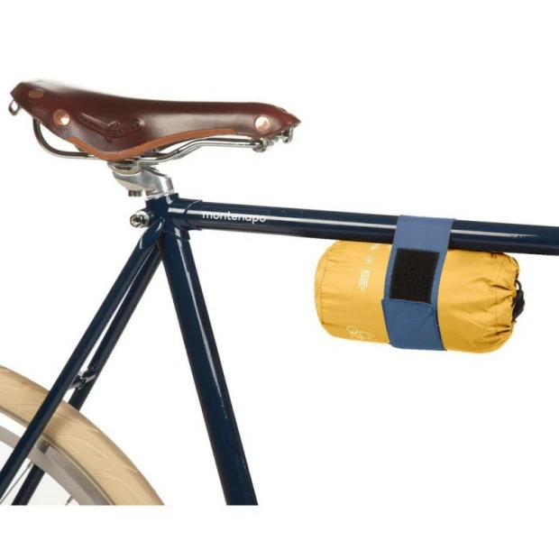 - Rangement en pochette pour un encombrement minimal, avec système d’accrochage au vélo/sac à dos