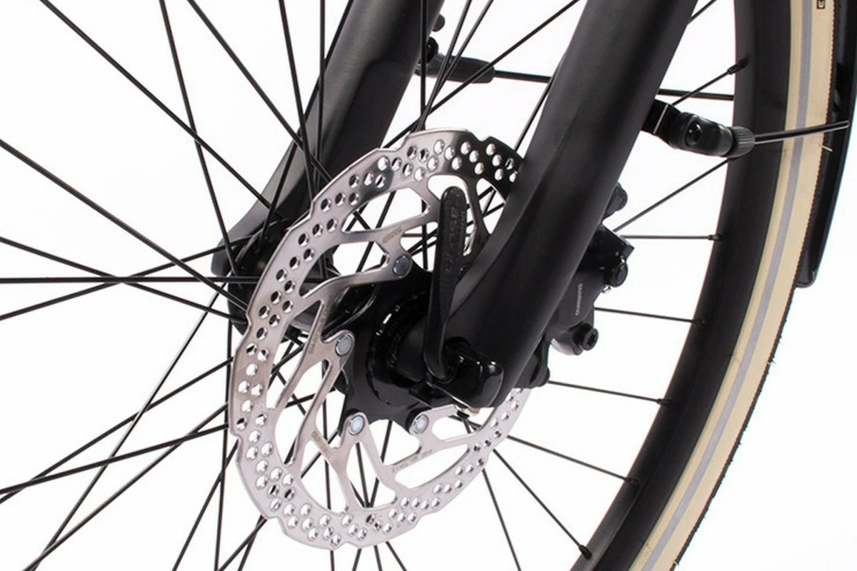 L’Iswan City Boost 6.1 est monté avec un dérailleur Shimano Altus 8 vitesses, des freins à disques hydrauliques Shimano MT200 160mm, des lumières puissantes et des pneus anti-crevaison avec bandes réfléchissantes pour une visibilité accrue en ville.