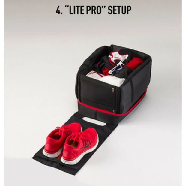 - Fonction “LITE PRO”: Conçue pour les triathlètes de niveau avancé quand il n’y a pas assez de place dans la zone de transition. Il faut décrocher le couvercle supérieur et l’appliquer au fond, sortir les deux sacs porte-chaussures (cyclisme et course), décrocher le sac T1, accrocher les chaussures de cyclisme au vélo, mettre le sac porte-chaussures T1 vide à l’intérieur du sac et n’appliquer que le sac porte-chaussures de course T2 face au Triathlon Box. Il faut ensuite ouvrir les 4 fermetures latérales jusqu’à la moitié de leur longueur, plier les parties latérales en insérant les extrémités dans le couvercle qui a été appliqué au fond. De cette manière on aura des encombrements réduits et tout le matériel sera rangé et utilizable de manière hyperrapide pendant la course (Fig.4).